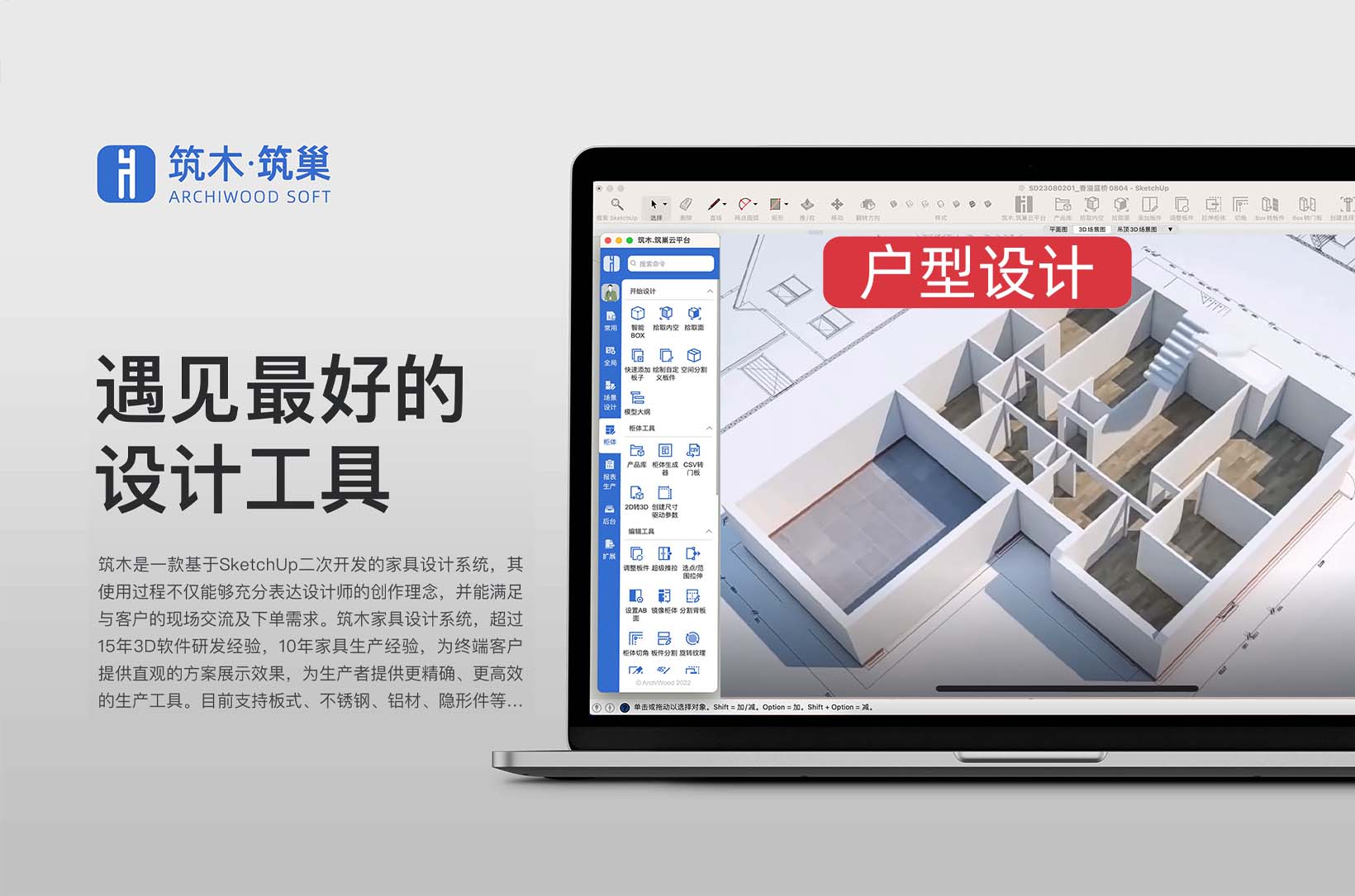 筑木.筑巢的全称是筑木·筑巢家具设计系统,是一款基于SketchUp平台二次开发的专业家具设计软件(让您遇见最好的设计工具)。筑木筑巢完全继承了SketchUp各种优秀特性,具有易学易用、自由设计、异形强大、门墙柜一体、一键报表\五金、生产工艺多样、设计即拆单生产等特点。筑木筑巢也非常适合SketchUp用户进行室内正向全流程设计。问题咨询请加潘总微信号:pf106055 少校微信号:sketc… -